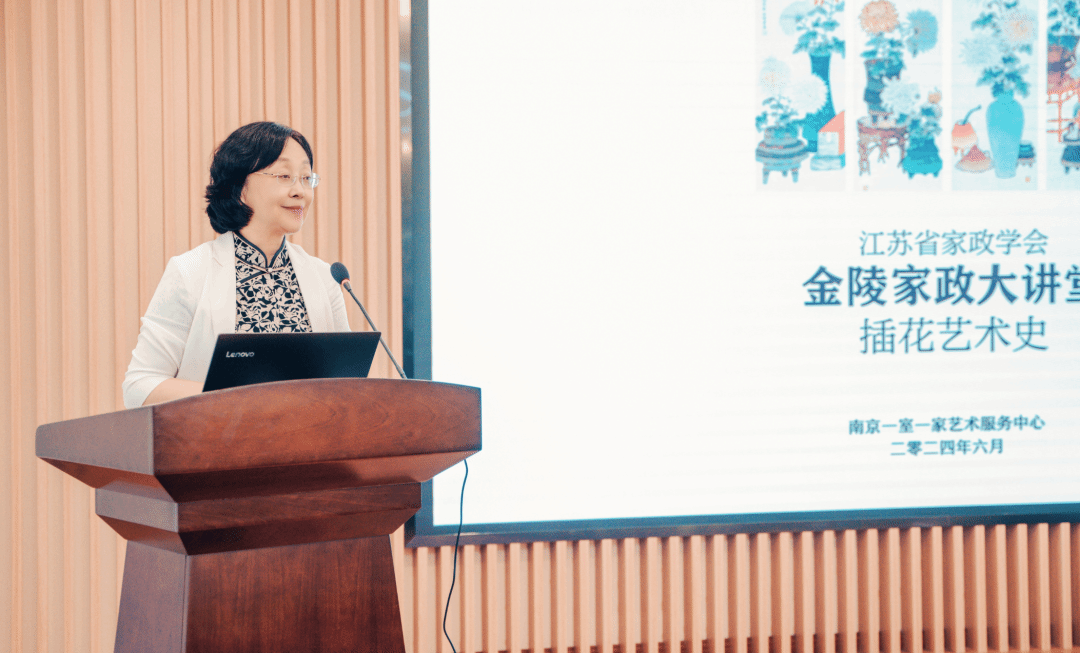 赵媛在活动致辞中说:“家政创造美好生活!它不仅提供传统意义的清洁、烹饪等服务,更重要的是彰显出人们对健康生活方式的追求。花道与茶道、香道并称为三雅道,它们对人们的生活情趣、审美艺术和情志表达至关重要。金陵家政大讲堂就是要积极倡导以茶会挚友,以香养情志,以花涤心尘,聚合社会各方面的智慧和能量,为大家创造现代、健康、丰富的美好生活。”