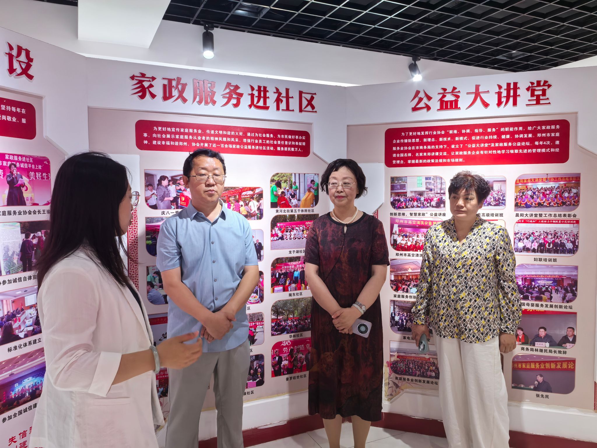 19日,调研组赴河南省家庭服务业协会、郑州市家庭服务业协会调研,参访了协会综合展厅。王瑜会长向调研组就近年来协会的技能培训工作、会员发展工作、行业规范工作、企业赋能工作以及积极服务政府的实事等进行了详细介绍。
