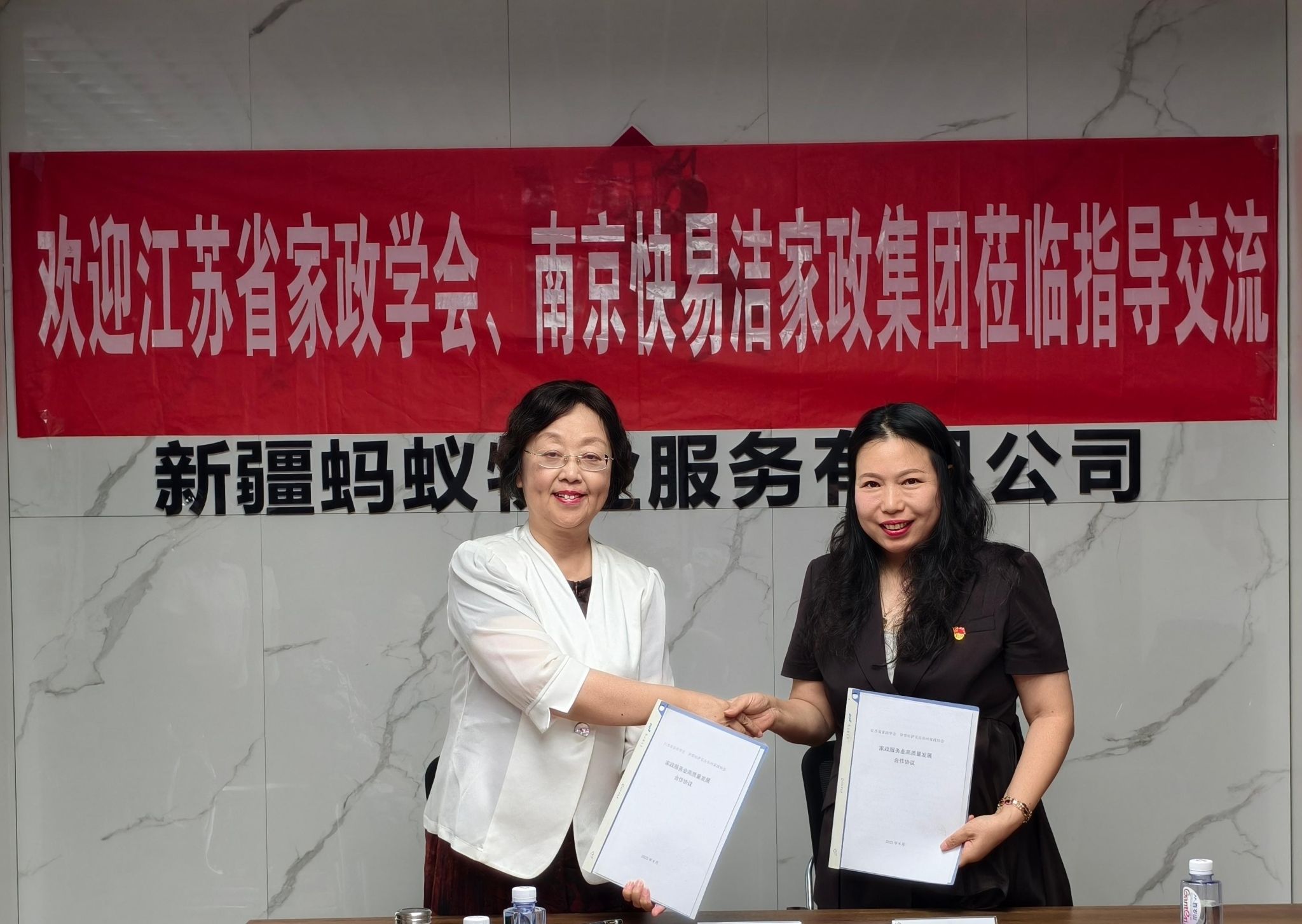江苏省家政学会理事长赵媛与伊犁州家政服务业协会会长李晓娜签订了《江苏·伊犁家政服务业高质量发展合作协议》,南京快易洁家政集团总经理夏宁和新疆伊犁蚂蚁家政服务有限公司总经理李晓娜签订了《宁伊家政劳务合作协议》。
