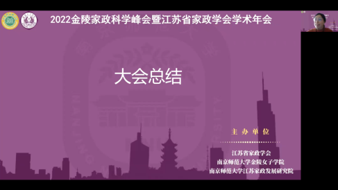 12 月 11 日上午11时,2022金陵家政科学峰会暨江苏省家政学会学术年会举行闭幕式。闭幕式由江苏省家政学会理事长赵媛教授主持。闭幕式上为本次峰会优秀论文获奖者颁奖,熊筱燕教授做大会总结。