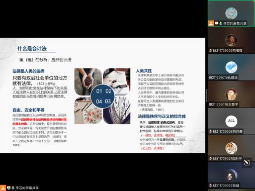 李芸老师向同学们推荐了《资本主义的法律基础》、《西方哲学史》、《法理学》等书目,并鼓励大家进行阅读。在本次讲座的尾声中,杨雄胜教授对本次会议进行了总结。杨教授提出,中国改革开放以来,中国会计经历了西方会计未曾经历的路程,而中国与西方的不同在于中国的《会计法》的存在,所以对于《会计法》的深入研究可能会揭示中国会计过去几十年发展的规律,并为中国会计未来的发展指明道路。最后,本次会议在同学们评论区的热烈感谢中圆满结束。