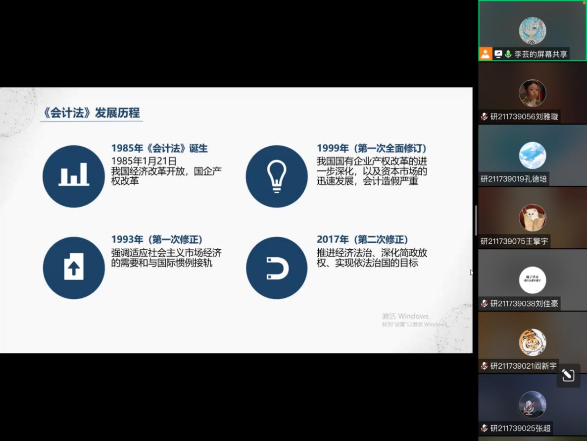 会计与财务管理系主任李芸副教授做题为“《会计法》修订的价值诉求和总体框架设计”的线上讲座。