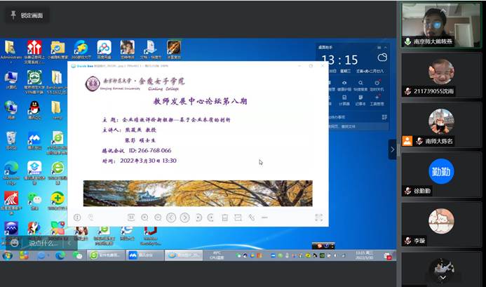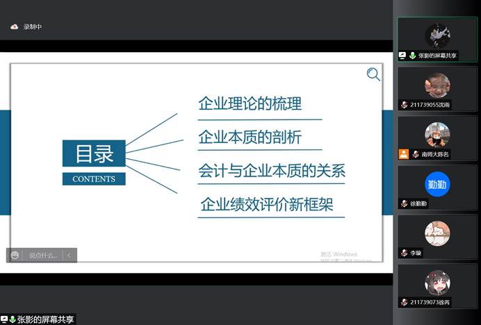2022330日下午1330,百家乐平台 第八期教师发展中心论坛在线上如期顺利举行。论坛主题是《企业绩效评价新框架——基于企业本质的判断》,由熊筱燕教授和21级会计学硕张影同学主讲。百家乐平台 特聘院长杨雄胜教授、副院长封思贤教授、会计系全体教师和2021级会计学硕、会计专硕参加了本次学术论坛。