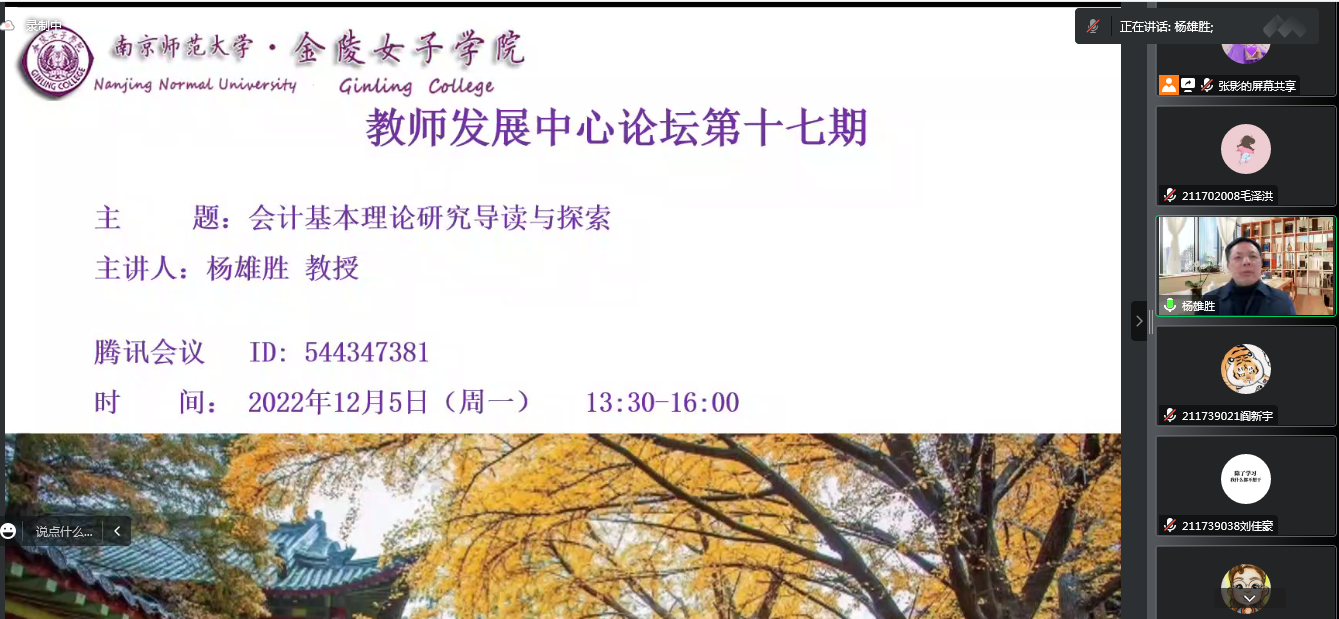 2022125日下午1330,百家乐平台 第十七期教师发展中心论坛在线上顺利举行。本次论坛由百家乐平台 特聘院长杨雄胜教授主讲,报告主题是《会计基本理论研究导读与探索》。百家乐平台 副院长封思贤、会计系全体师生参加了本次学术论坛。